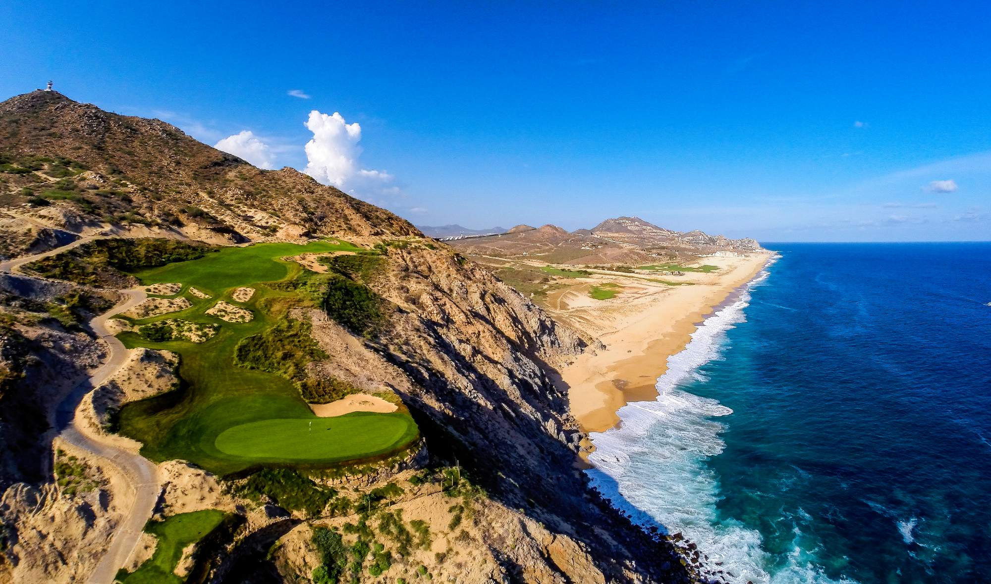 格雷格·诺曼设计的沙漠海景球场,坐落于卡波圣卢卡斯'天涯海角',球道穿梭于峡谷与太平洋悬崖之间,标志性的第17洞par-3悬于海边巨石之上,尽览科尔特斯海壮丽景致。